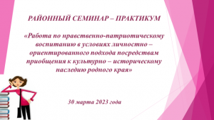 На базе ГБДОУ детский сад № 7 Выборгского района 30 марта 2023 года прошел семинар-практикум «Работа по нравственно-патриотическому воспитанию в условиях личностно – ориентированного подхода посредствам приобщения к культурно – историческому наследию родного края». Семинар был организован для педагогов района. В рамках семинара педагогами был представлен опыт работы с детьми по нравственно-патриотическому воспитанию дошкольников. Своим опытом делились педагоги ГБДОУ № 7 и ГБДОУ № 6.