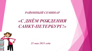 25 мая 2023 года на базе ГБУ ИМЦ Выборгского района прошел районный семинар: «С Днем рождения Санкт-Петербург!». Своим опытом работы делились педагоги ГБДОУ детский сад № 3; ГБДОУ детский сад № 91 и ГБДОУ детский сад № 115. На семинаре были рассмотрены следующие темы: