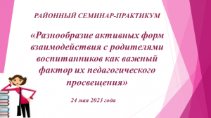 24 мая 2023 года на базе ГБУ ИМЦ Выборгского района прошел районный семинар-практикум: «Разнообразие активных форм взаимодействия с родителями воспитанников как важный фактор их педагогического просвещения». Опытом работы поделились педагоги ГБДОУ детский сад № 1 Выборгского района. Были рассмотрены следующие темы: