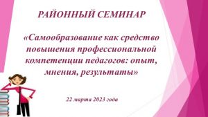 На базе ГБУ ИМЦ 22 марта 2023 года прошел семинар «Самообразование как средство повышения профессиональной компетенции педагогов: опыт, мнения, результаты». Семинар был организован для зам. зав. по УВР, методистов и педагогов района.