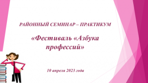10 апреля 2023 года на базе ГБДОУ детский сад № 107 Выборгского района прошел семинар-практикум «Фестиваль «Азбука профессий». В ходе семинара участниками сетевого инновационного проекта «Технология успеха. Ранняя профориентация как форма выявления, поддержки и сопровождения способных и талантливых детей», в который входят ГБДОУ № 32, 64, 107, 126 Выборгского района Санкт-Петербурга, были представлены мастер-классы с детьми старшего дошкольного возраста по ранней профориентации: